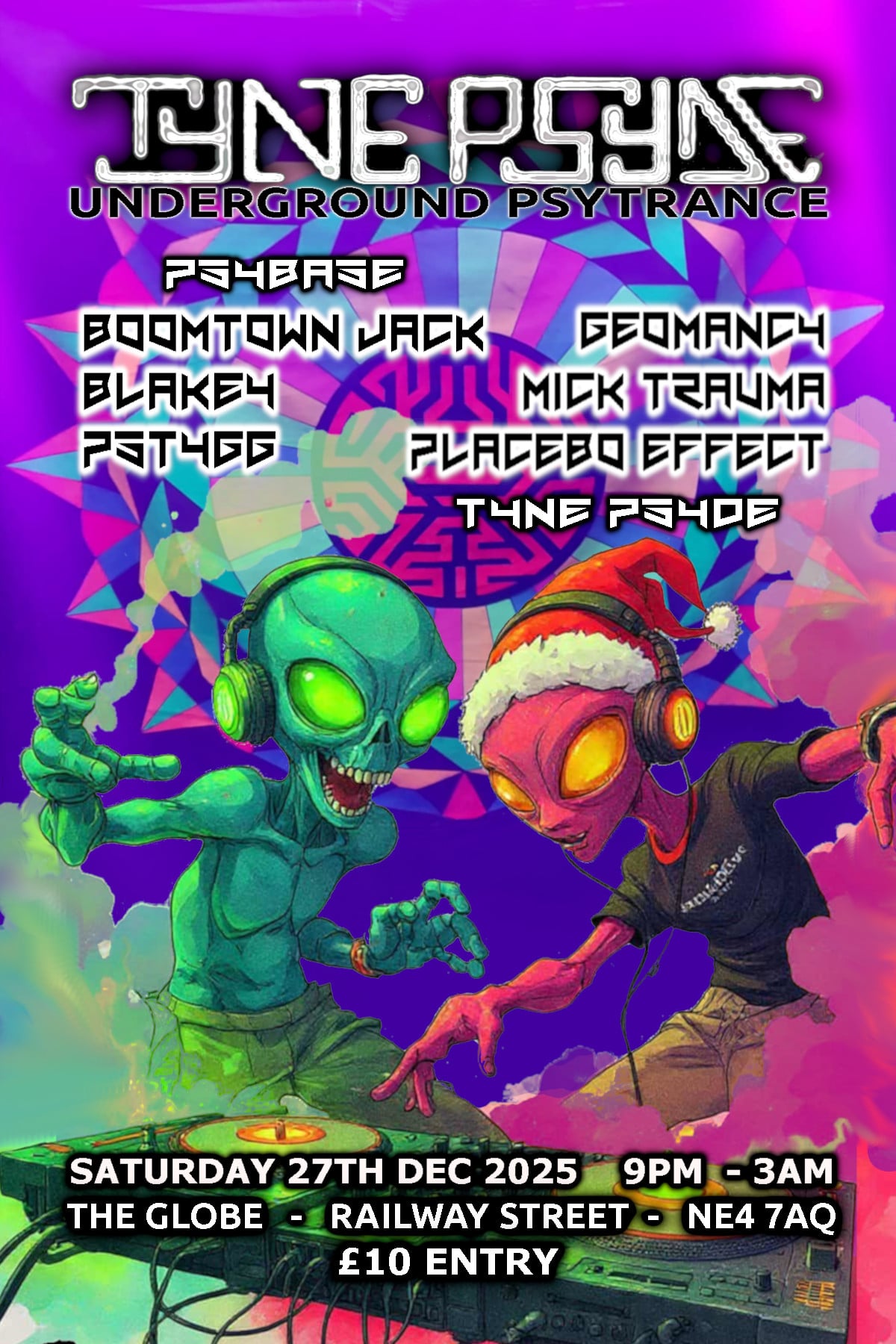 Next event will be the Tynepsyde Christmas party on the 27th December. Guest Djs for the night will be Boomtown Jack, PsTyGg & Blakey from the Psybase crew. Expect Tynepsyde's own sound systems, lights & UV decor throughout the venue.